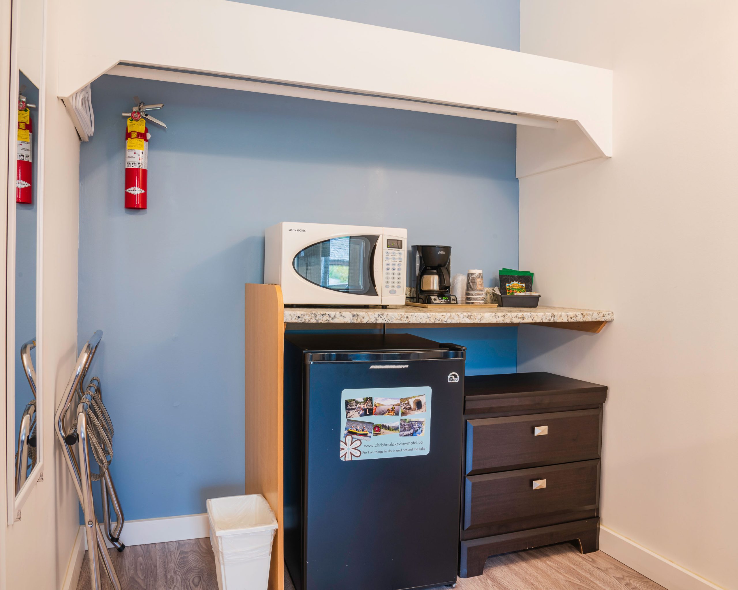 Our standard queen rooms come equipped with a small fridge, microwave, and coffee maker. All rooms include a flat-screen TV (HDTV with a full cable package), high-speed internet (WIFI), alarm clock, and a full bathroom with a tub and shower. Each room also has a small outdoor sitting area where you can enjoy your morning coffee, and all guests have access to the barbecue and fire pit in the shared outdoor space.